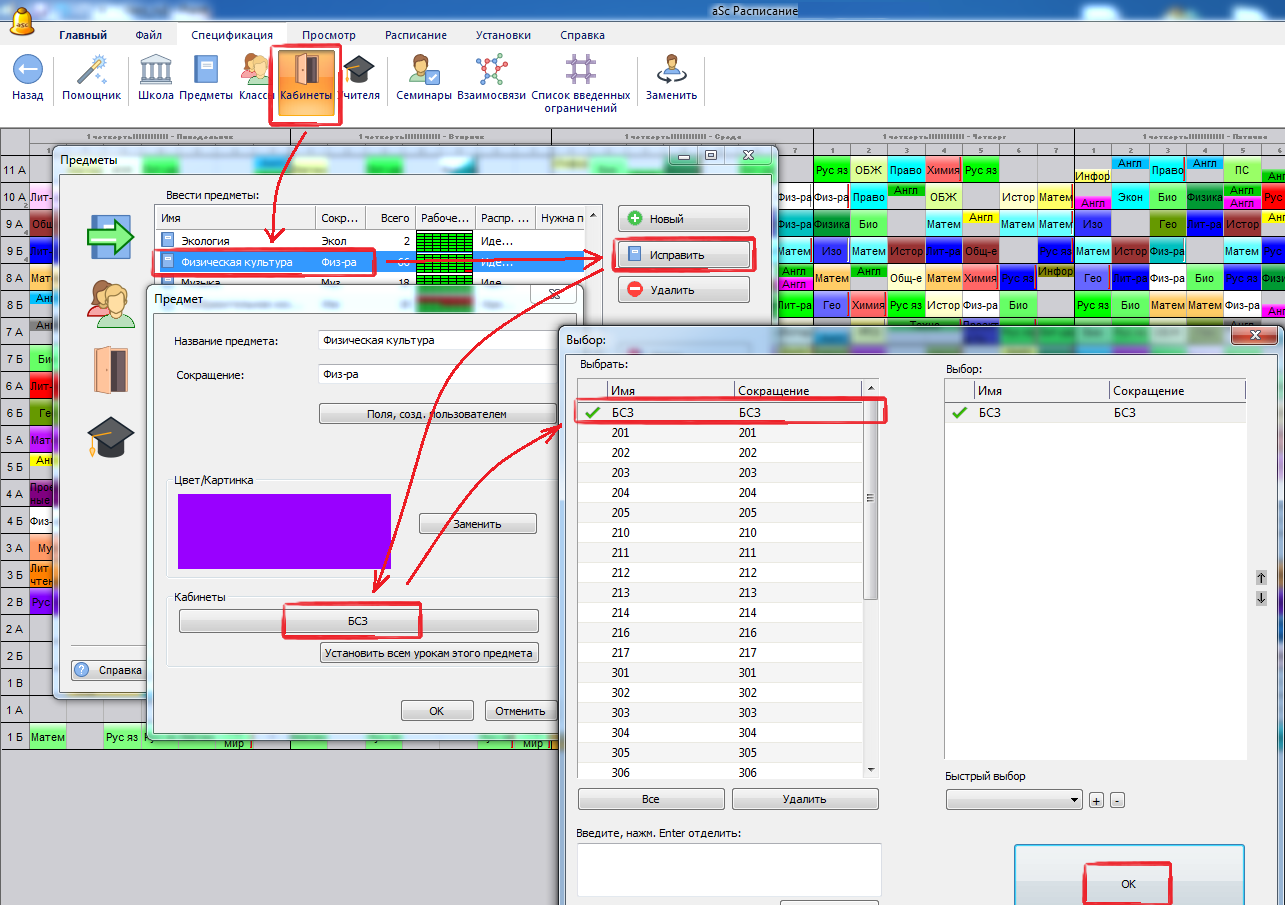 Для каждого предмета можно указать, что уроки по этому предмету должны быть в определенных кабинетах: