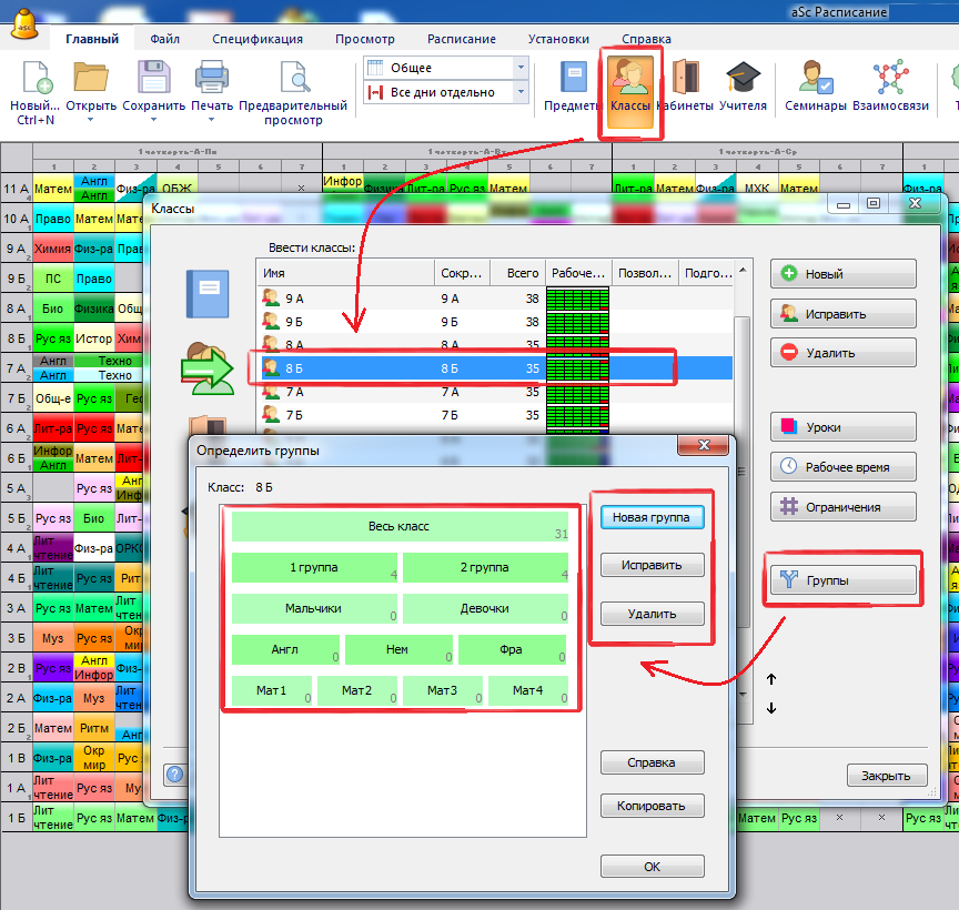 Например: Физкультура - 2 раза в неделю для группы мальчиков. Или английский - 3 раза в неделю для преуспевающей группы. Или математика - 3 раза в неделю для целого класса, так как целый класс - также группа.
