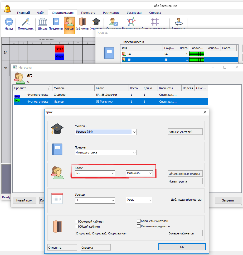 Есть урок физкультуры, объединенный для девочек из двух классов, но мальчики из этих классов имеют отдельный урок для каждого класса.
