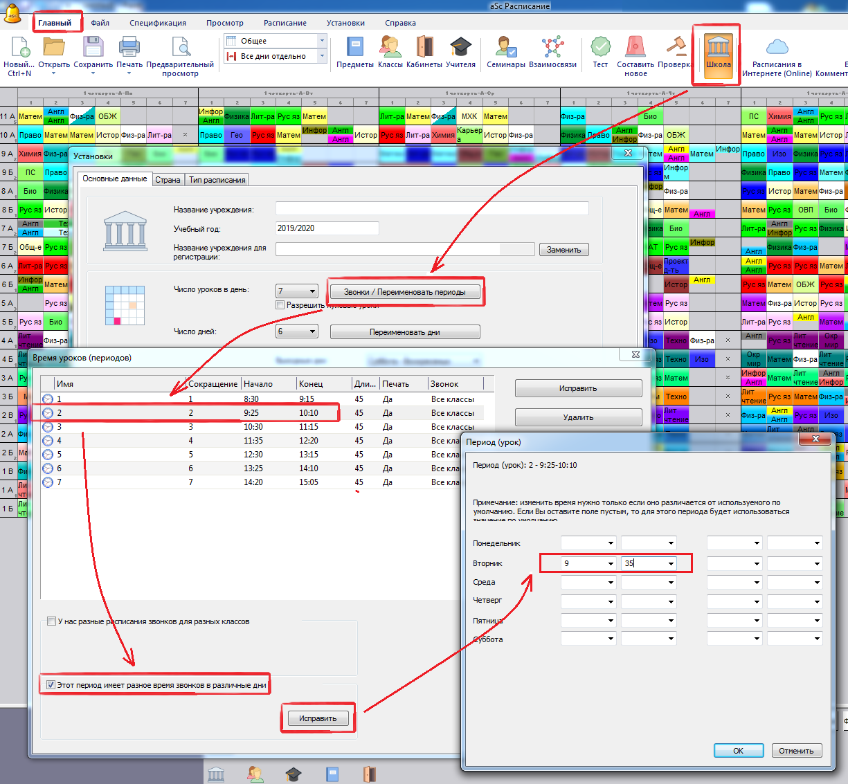 В меню Главный/Школа можете найти окно для изменения времени звонков.