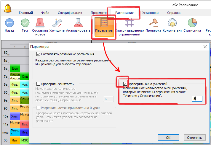 Если в Вашей школе такие проблемы не возникают, тогда просто не помечайте галочкой опцию "Проверять окна для учителей" в меню "Расписание / Параметры".