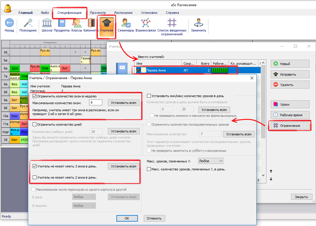 Ограничить количество окон для каждого учителя индивидуально можно через меню Спецификация / Учителя / Ограничения:
