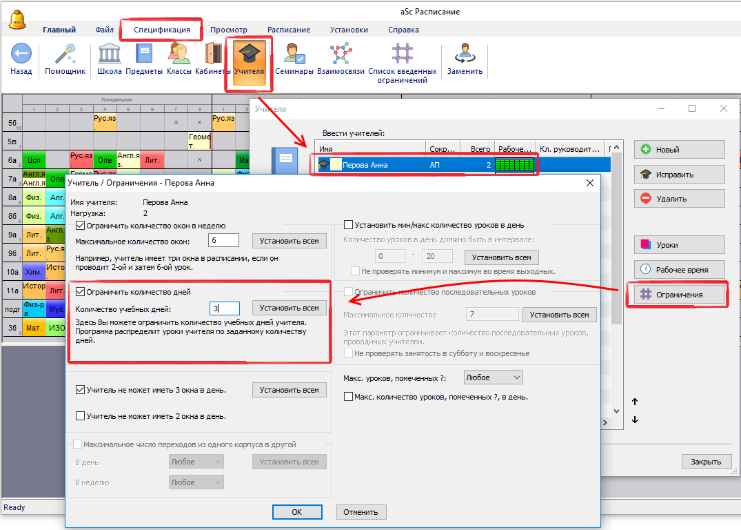 - этот способ использовать более разумно, чем ограничить в Рабочем времени, так как он дает программе больше свободы выбора. Поэтому, если учитель не высказал предпочтений насчет конкретных дней, используйте этот метод.