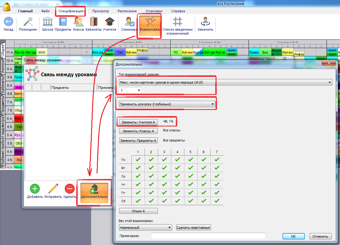 Однако, если Вы действительно имеете два независимых учителя и не хотите, чтобы они учили в то же самое время, Вы можете определить дополнительную взаимосвязь уроков, которая определяет максимальное число карточек уроков в одной позиций: