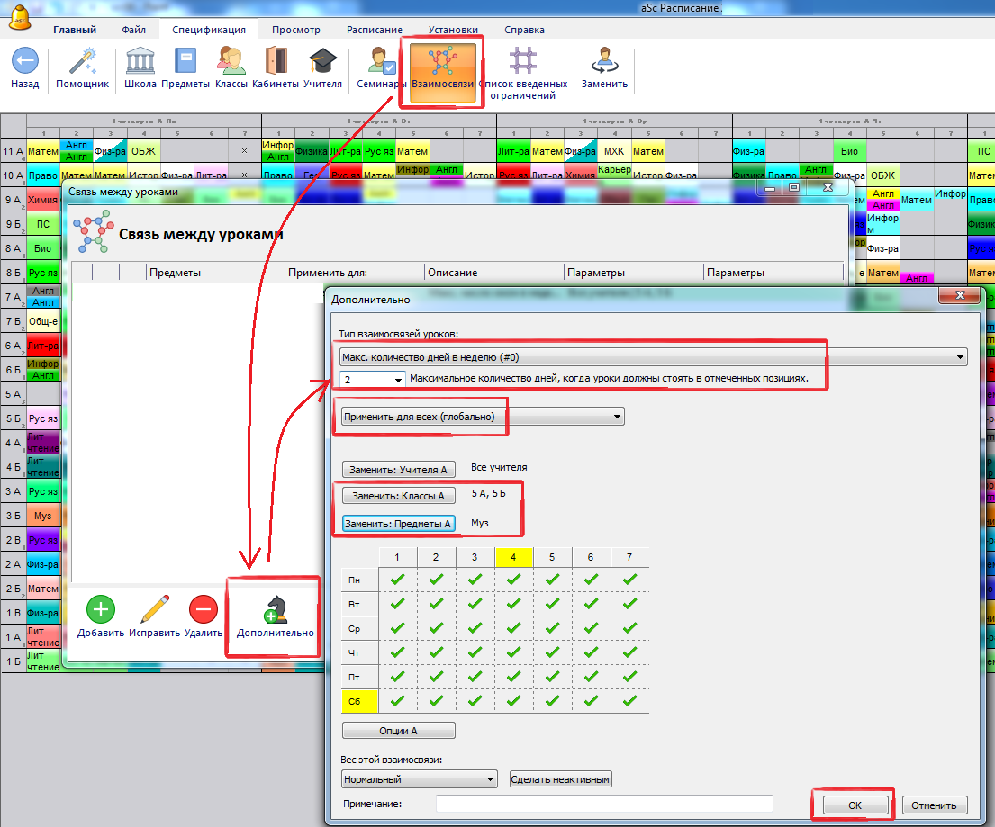 2. Однако вышеуказанное взаимоотношение будет обеспечивать, чтобы не было окна между уроками музыки у 5А и 5Б классов если уроки музыки проходят в тот самый день. Поэтому, добавим взаимосвязь, что эти уроки должны быть в один день:
