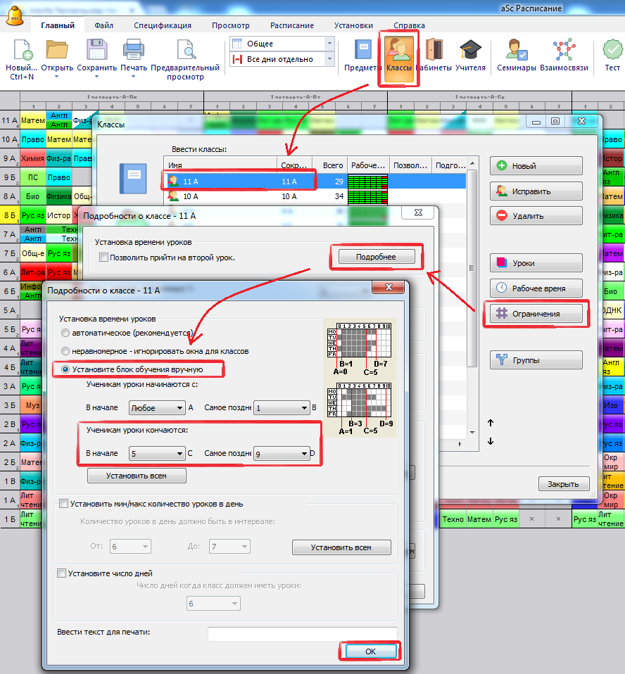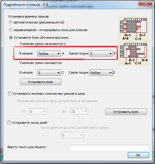 В "блоке обучения" задается время, когда классы могут начать и закончить уроки - в основном это установление минимального и максимального числа уроков в день. Вы можете определить это более детально, если только требуется. См. Как установить мин/мах число уроков в день для одного класса?