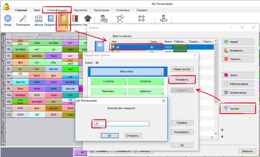 При составлении расписания, программа будет учитывать вместимость кабинетов, а также предупредит вас, если вы поместили большой класс в маленький кабинет: