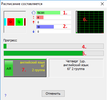 1. Индикатор общего хода работы. Он показывает число проверенных вариантов расписания. Также он показывает, сколько карточек уроков программа не сумела поместить в расписание. Если алгоритм программы не был в состоянии поместить некоторые карточки уроков в расписание, цвет индикатора изменится и будет показано число непомещенных уроков / общее число уроков. Например, 3/768. Составление будет продолжаться, однако Вы можете попробовать остановить программу и запустить составление расписания еще раз и/или облегчить некоторые ограничения.