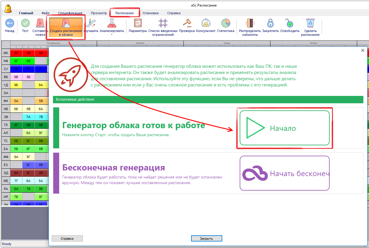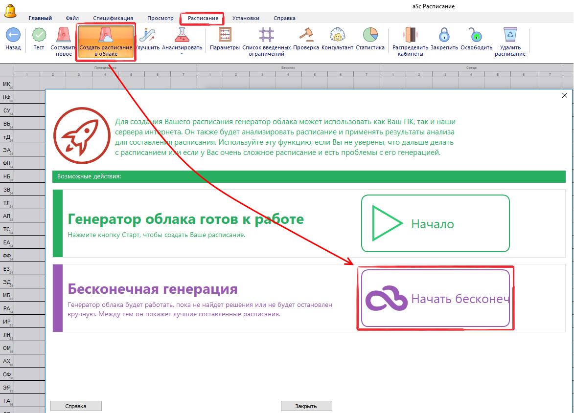 Облачный (интернетный) генератор использует ваш компьютер и наши серверы, чтобы помочь вам составить расписание. Облачный генератор особенно полезен, если вы не уверены, как сгенерировать свое расписание, какие параметры использовать или у вас очень сложное расписание. Облачный генератор способен обучаться создавая различные расписания и может использовать накопленный опыт также при создании вашего расписания.