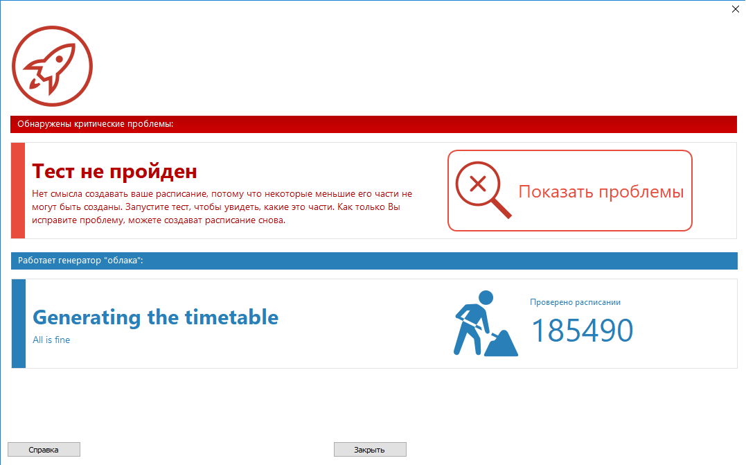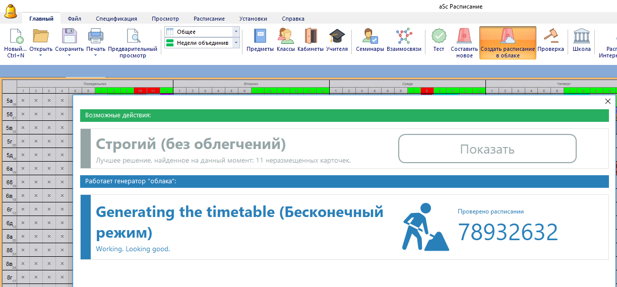Облачный генератор немедленно начнет работать. Он покажет, сколько вариантов расписаний он проверил.