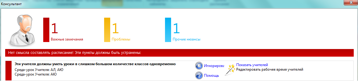 Это означает, что для этих трех классов на этом периоде остается только два учителя, которые могут их обучать и для одного класса образуется окно. Эту ситуацию программа расценивает как ошибку, совершенную при вводе данных.