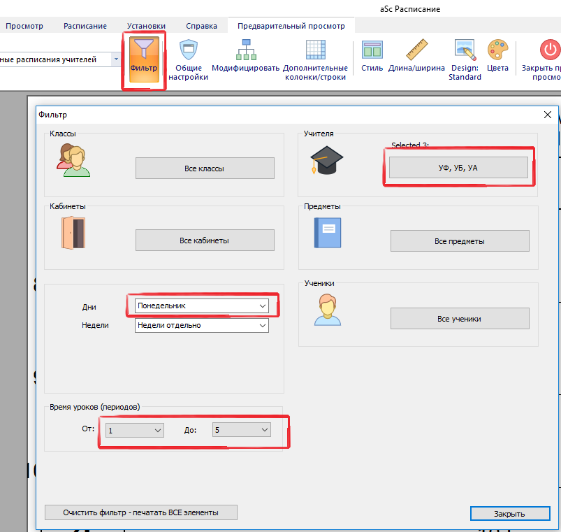 Фильтр является общим для всех распечаток, поэтому он будет влиять на все распечатки. Например, если выберите 3 учителя, то в общем расписании учителей будет только 3 строки. В расписании для каждого учителя будет выводить 3 страницы.