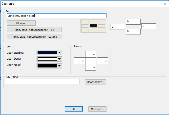 Отметьте, что текст позволяет Вам определять и изменяющийся текст - вместо того, чтобы создавать дизайн для каждого класса с названием класса, Вы можете создать один дизайн с текстом {Класс:Имя}. Эта часть текста будет заменена названием класса во время распечатки. Также можете использовать шаблон {Школа:Название учреждения для регистрации}.