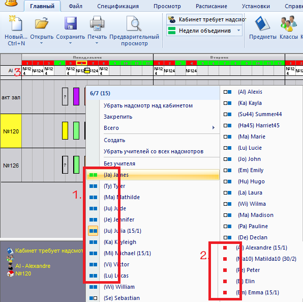 Красный цвет (2) показывает, что он уже имеет назначенный надсмотр в некотором другом кабинете в это время. Числа после имени учителя показывают, сколько надсмотров он уже имеет (минуты/число).