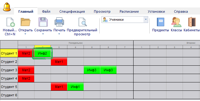 Когда Вы возьмете урок, программа покрасит зеленым цветом возможные позиций, где этот урок может быть помещен.