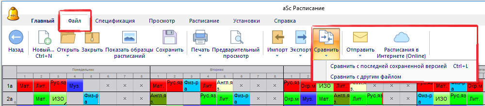 Сравнить с другим файлом расписания... - предложит выбрать другой файл расписания и сравнить его с текущим.