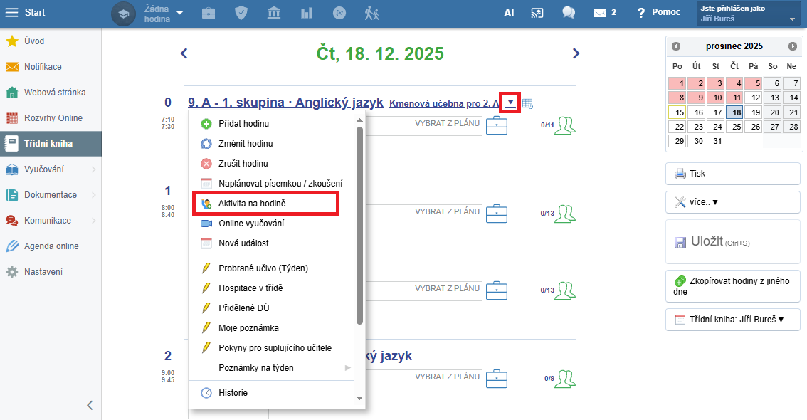 V třídní knize vyberte z rozbalovacího menu u hodiny Aktivita na hodině.
