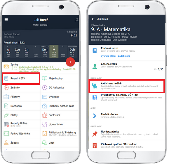 V mobilní aplikaci tuto funkci najdete v dlaždici Rozvrh/ETK.