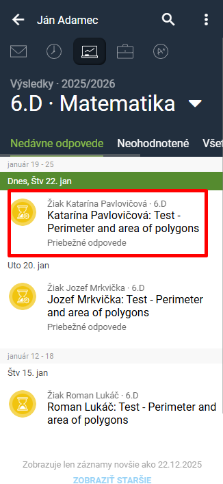 Učiteľ môže monitorovať priebeh testu aj cez mobilnú aplikáciu takto: