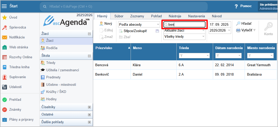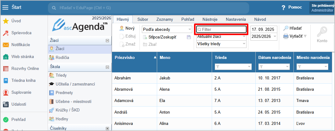 Ak chcete vyhľadať konkrétnu položku v aktuálnom pohľade, napr. konkrétneho žiaka, použite vyznačený filter.