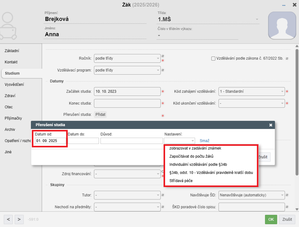 Individuální vzdělávání žáka v MŠ podle §34b zadáte přes přerušení studia v Agendě Online v kartě žáka, v záložce „Studium – Přerušení studia – Přidat“: