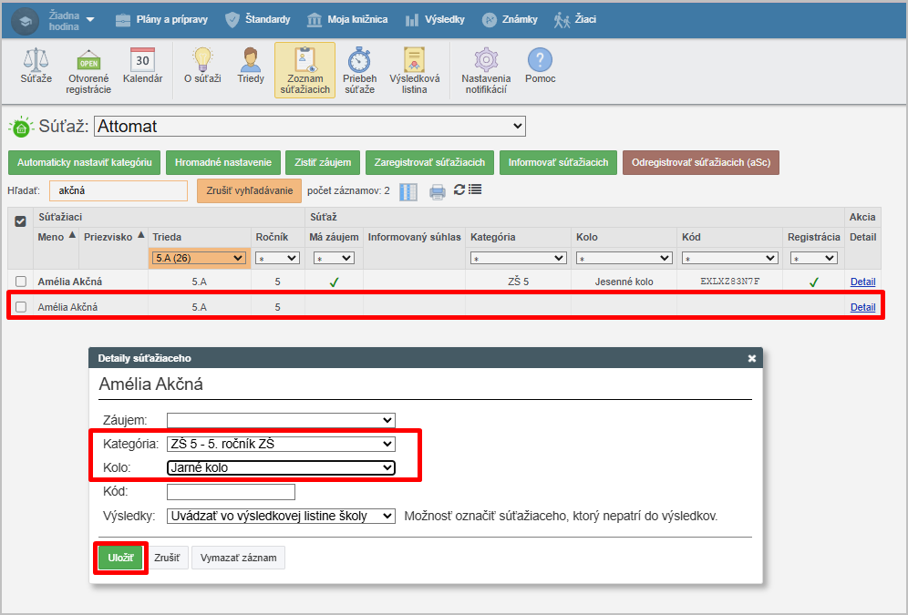 Žiakom pribudnú nové záznamy pre nové kolo/kategóriu. Zaškrtnite tieto nové záznamy a kliknite na Zaregistrovať súťažiacich. Takto ich naraz zaregistrujete v ďalšom kole/ kategórii: