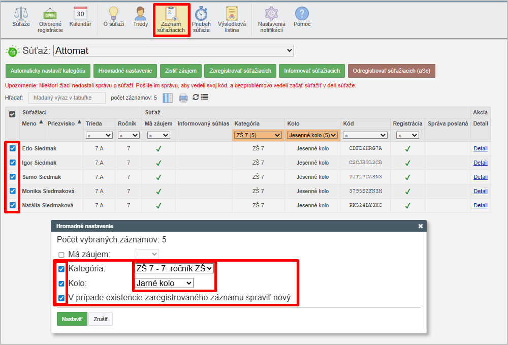 Zaškrtnite žiakov a zvoľte Hromadné nastavenie. Nastavíme žiakom kategóriu, kolo a tiež zaškrtneme, aby v prípade existencie záznamu vyrobiť nový:
