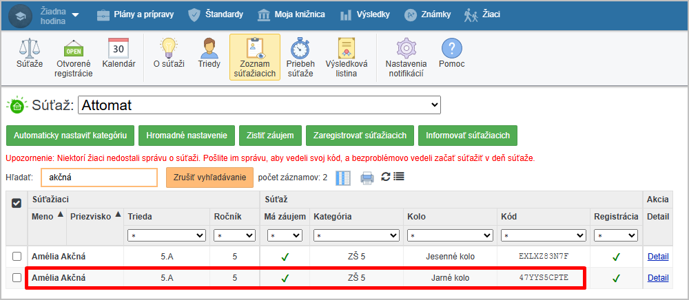 Žiačka Amélia Akčná je už zaregistrovaná v súťaži ATTOMAT v kategórii ZŠ 5 v jesennom kole a chce súťažiť aj v jarnom kole. Nakoľko je táto súťaž nepostupová, nie je možné ju zaregistrovať z výsledkovej listiny predchádzajúceho kola.