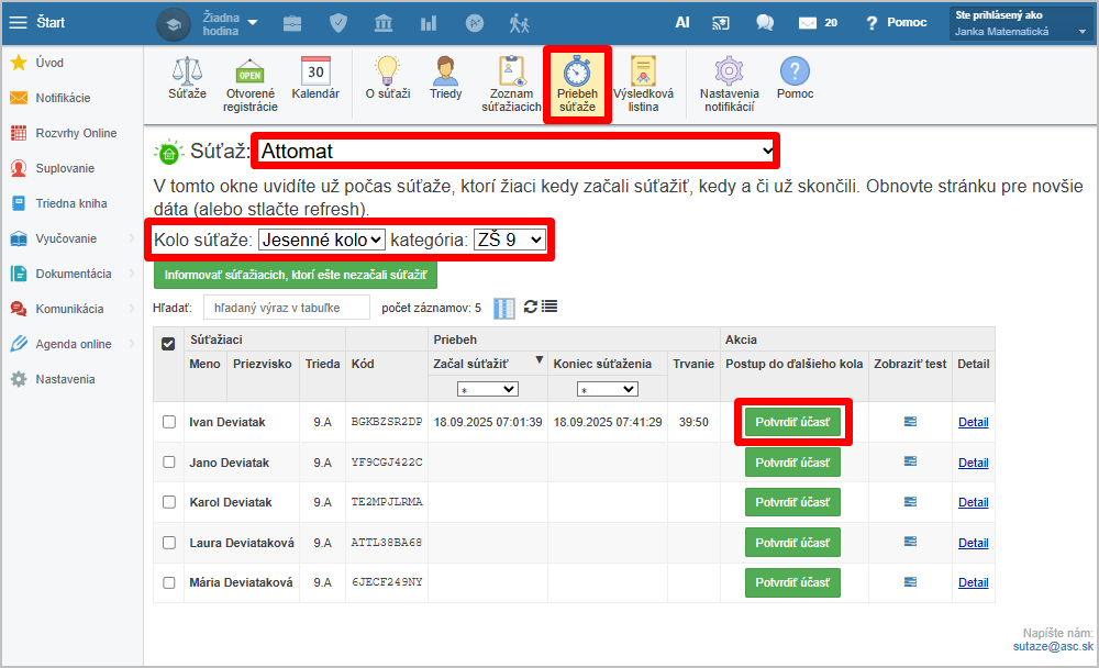 Registráciu žiaka do ďalšieho kola nepostupovej súťaže (Napr. Attomat/ Attoved), ktorý už bol zaregistrovaný na prvé kolo urobíte jednoducho jedným klikom v časti "Priebeh súťaže" :