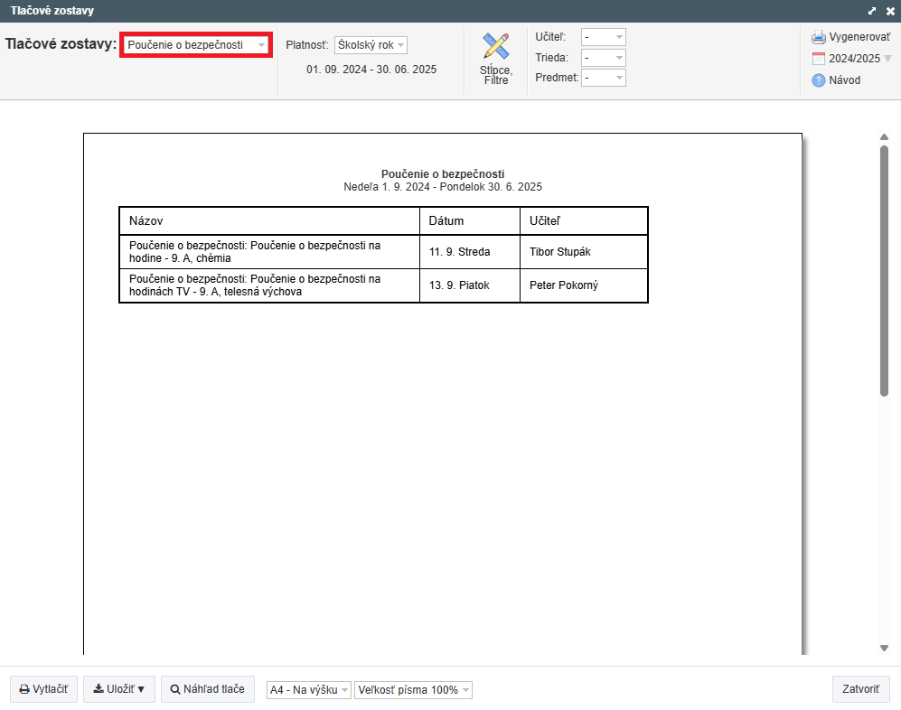 vyberte názov zostavy "Poučenie o bezpečnosti":