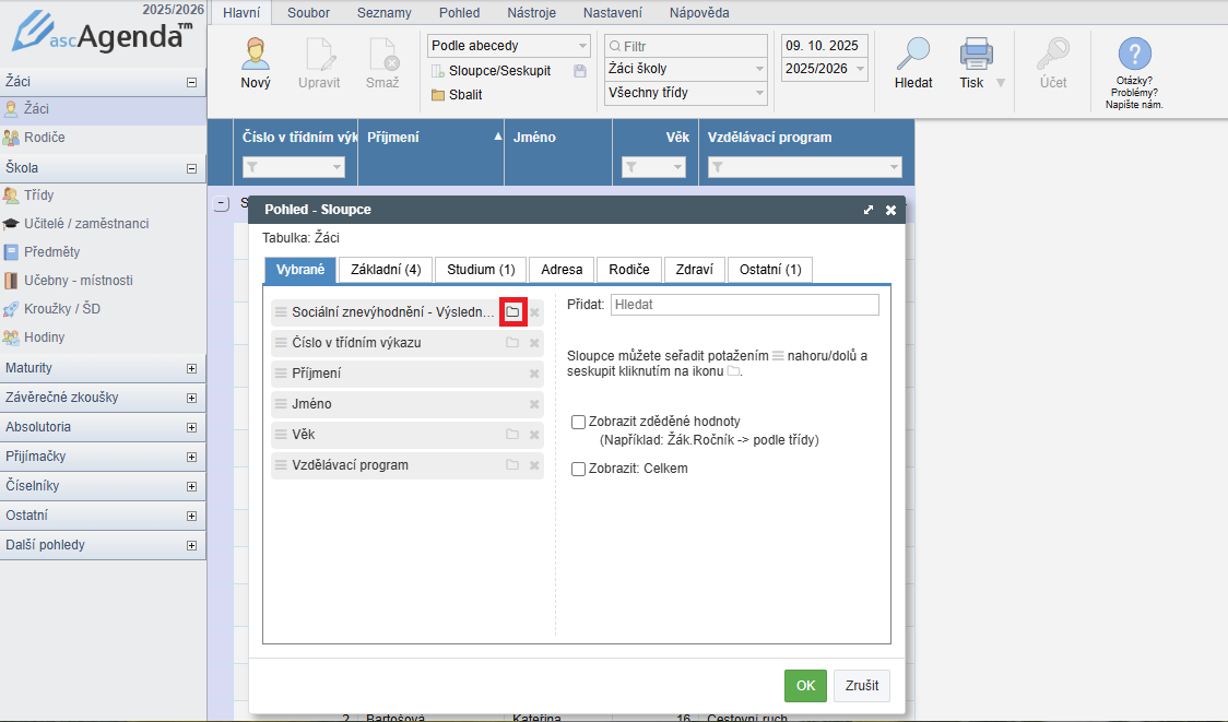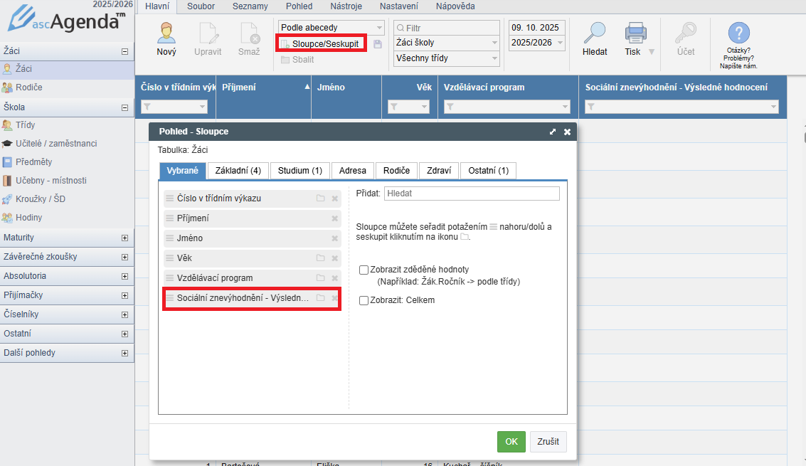 V Agende Online si potom môžete cez stĺpce/filtre zobraziť položku Sociální znevýhodnění - Výsledné hodnocení