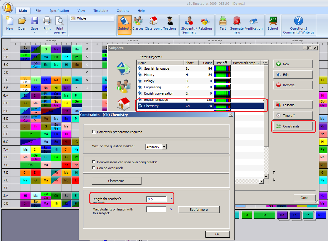 Od verzie 2009 je možné nastaviť pre každý predmet dĺžku hodiny, ktorá sa má započítavať do úväzku učiteľa. Napríklad, ak máte hodinu anglickej konverzácie, ktorá sa započítava ako 0,5 hodiny do celkového úväzku učiteľa, môžete túto dĺžku špecifikovať v menu Predmety / Podmienky. Toto číslo sa týka iba úväzku učiteľa.