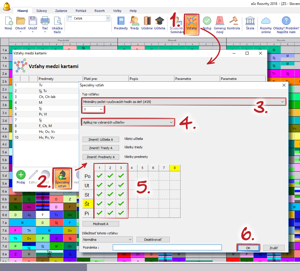 Môžete pridať špeciálny vzťah #29, v ktorom zadefinujete, aby každý učiteľ mal na prvých troch vyučovacích hodinách aspoň jednu hodinu: