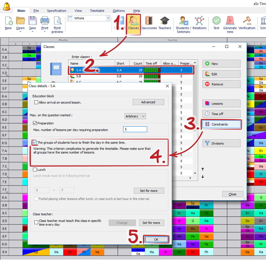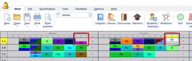 Program môže štandardne vygenerovať rozvrh, kde polovička triedy má v pondelok 6. hodinu Angličtinu, kým druhá polovička triedy ide po 5.hodine domov. Ďalší deň sa skupiny vymenia: