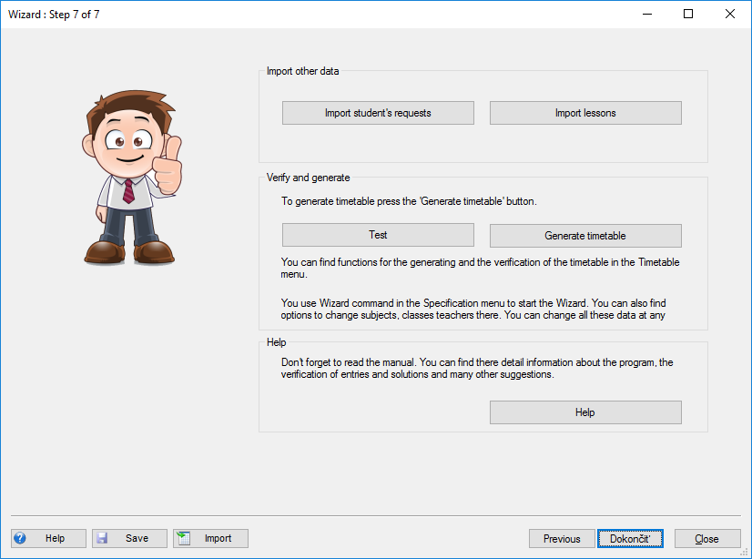 Po zadaní základnych údajov si môžete vygenerovať rozvrh. Na generovanie rozvrhu stlačte tlačítko "Generuj rozvrh" a ukončite Sprievodcu: