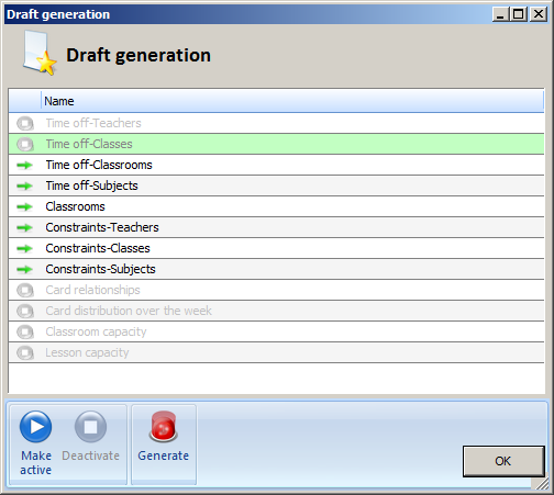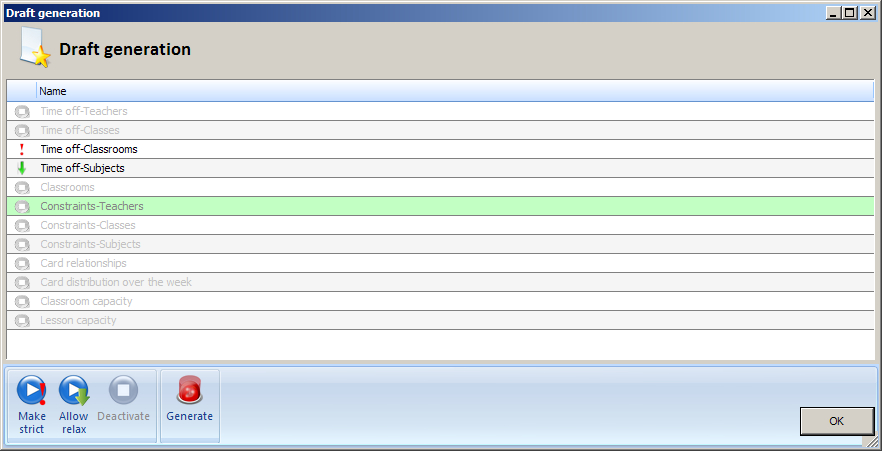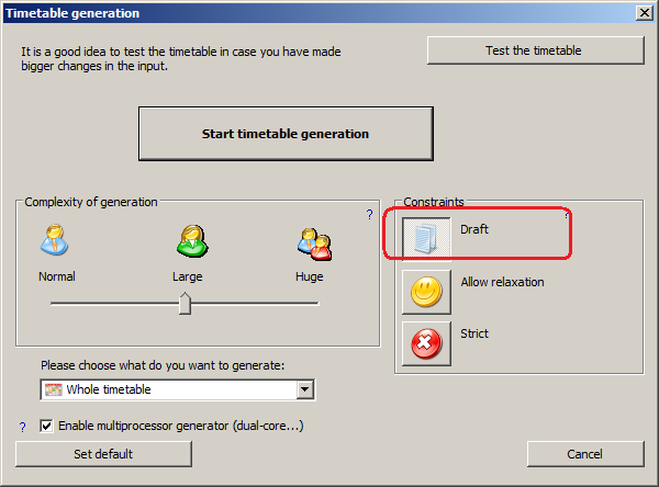 At early stages of timetable generation it is advised to try to generate draft. Draft is timetable without any constraints. This is very usefull, because it makes no sense to generate complete timetable with all the inputted constraints if there is some basic problem in the input.