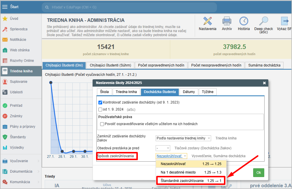 Ak žiak chýbal 0,4 hodiny, je správne uviesť tento údaj aj na vysvedčení. Ak však chcete zobrazovať na vysvedčení iba celé čísla, môžete si nastaviť, na koľko desatinných miest sa má počet vymeškaných hodín zaokrúhľovať. Ak zvolíte zaokrúhľovanie na celé čísla, žiakovi sa na vysvedčení zobrazí celé číslo, v tomto prípade 0 vymeškaných hodín.