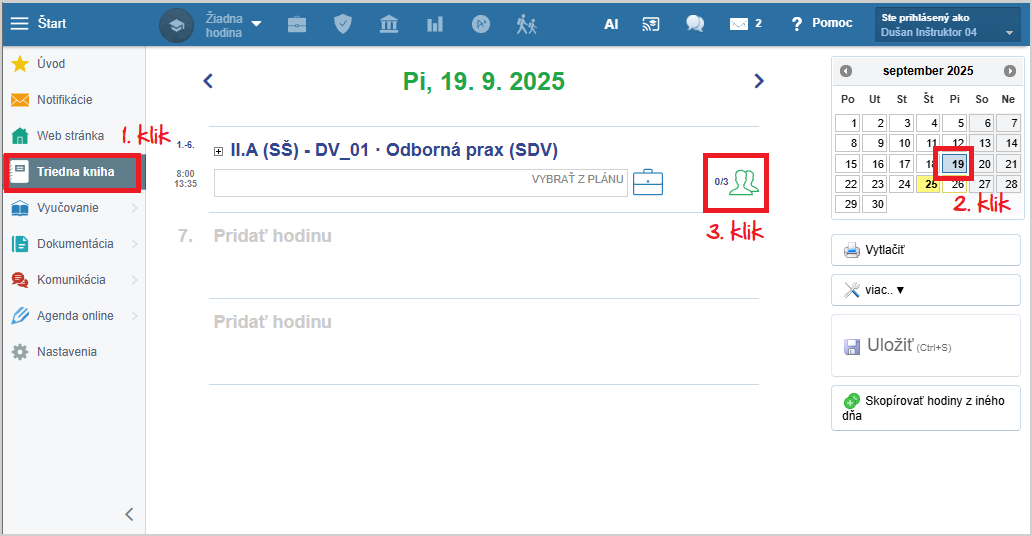 Ak kmeňová škola súhlasí, že inštruktor DV môže ospravedlňovať neúčasť žiakov na hodinách duálneho vzdeávanie, postupujte pri zadávaní dochádzky takto: