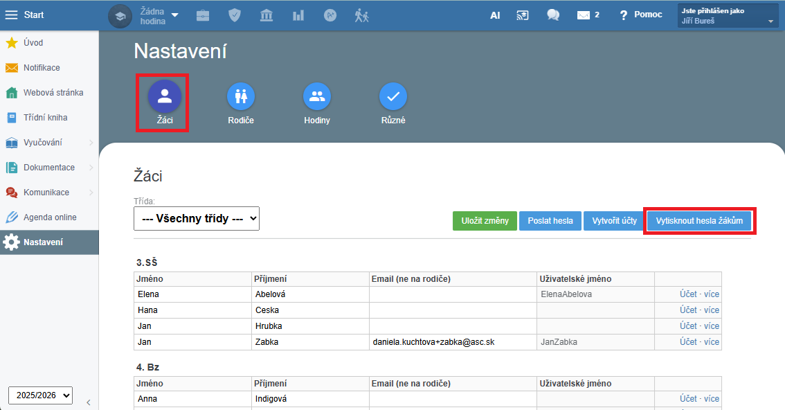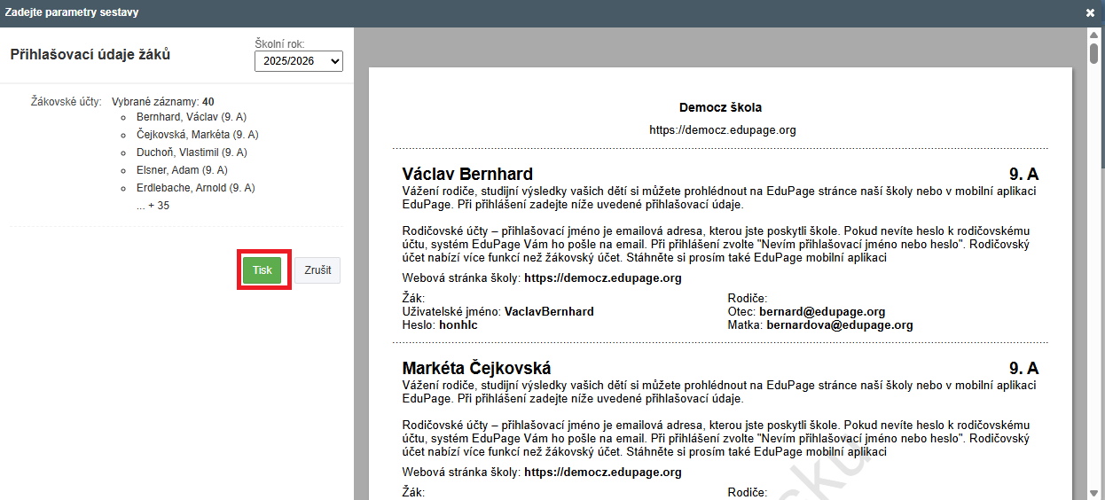 Nyní vidíte hesla žáků a můžete je vytisknout.