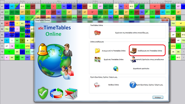 Για να αποθηκεύσετε online το ωρολόγιο σας, κάντε κλικ στο κουμπί "Timetables online" και στην συνέχεια επιλέξτε "Αποθήκευση στο Timetables Online"