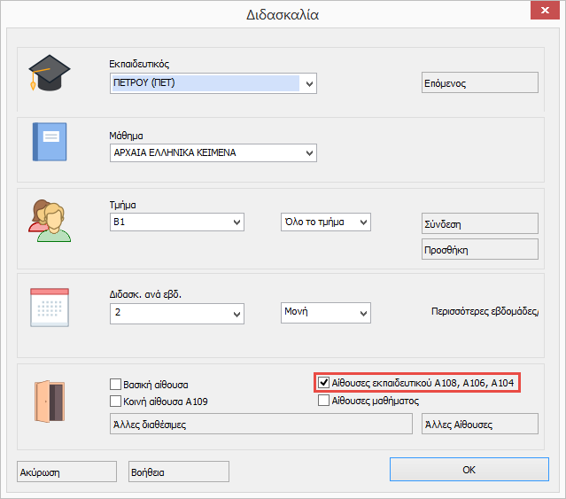 Αυτή η επιλογή είναι αυτόματα επιλεγμένη για τις διδασκαλίες που έχουν εκπαιδευτικούς με δικές τους αίθουσες. Μπορείτε φυσικά να επιτρέψετε η διδασκαλία και σε άλλες αίθουσες.