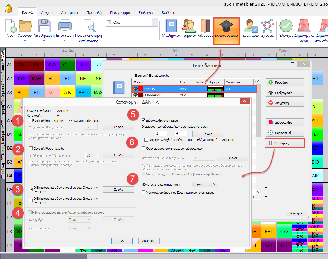 5. Ορισμός ελάχιστων/μέγιστων διδασκαλιών ανά ημέρα. Δείτε: Πως θα ορίσω τον ελάχιστο και τον μέγιστο αριθμό διδασκαλιών ανά ημέρα για έναν εκπαιδευτικό;