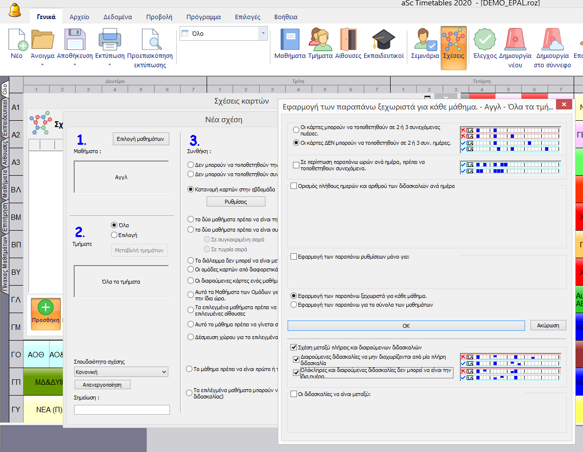 Σε μερικά εκπαιδευτήρια μερικά τμήματα όταν σπάνε σε ομάδες θέλουμε να κάνουν ταυτόχρονα οι ομάδες τις διδασκαλίες τους. Σε αυτήν την περίπτωση είναι σημαντικό να ορίσουμε μερικούς περιορισμούς ώστε το ωρολόγιο πρόγραμμα να δημιουργηθεί σωστά.