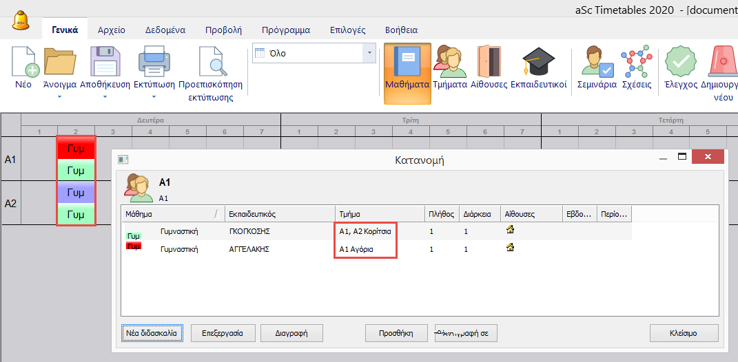 Προσοχή: Στο παράθυρο της κατανομής δείχνει μόνο τις διδασκαλίες του αντικειμένου του οποίου εξετάζουμε, άρα παραπάνω βλέπουμε μόνο τις διδασκαλίες του τμήματος Α1.
