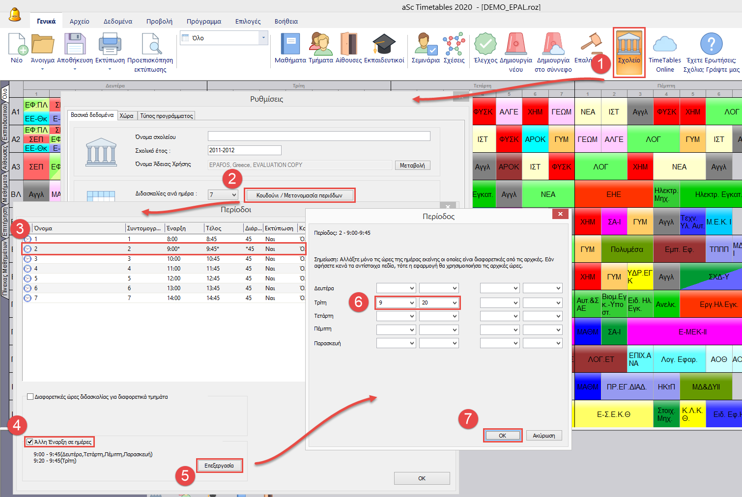 Μέσω του μενού Γενικά/Σχολείο μπορείτε να βρείτε το παράθυρο για την αλλαγή της ώρας έναρξης και λήξης των περιόδων.