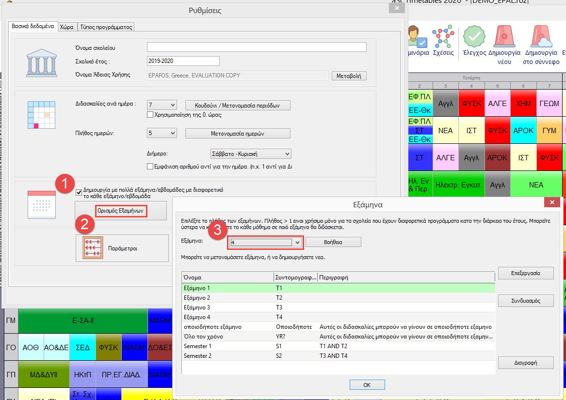 Μόλις ορίσετε ότι θέλετε να χρησιμοποιείται εξάμηνα, μπορείτε να δείτε την επιλογή εξαμήνου στην συνολική εικόνα του ωρολογίου.