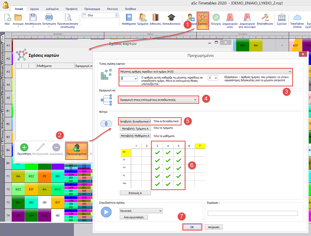Παράδειγμα: Η ώρα του γεύματος είναι μεταξύ 3ης και 5ης περιόδου. Αυτό σημαίνει ότι έχουμε 3 περιόδους διαθέσιμες. Άρα μπορούμε να εισάγουμε ότι ο εκπαιδευτικός μπορεί να διδάξει μέχρι 2 περιόδους την 3η με 5η περίοδο.
