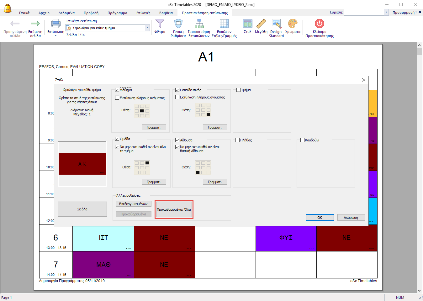 Το πρόγραμμα σας επιτρέπει να επεξεργαστείτε τα κείμενα που εκτυπώνονται στο ωρολόγιο. Αυτό βοηθάει σε μερικές ειδικές περιπτώσεις όπου θέλετε διαφορετικά κείμενα στο ωρολόγιο αυτό από ότι στο αρχικό. Για παράδειγμα Τάξη Α αντί για Α1/Α2/Α3.