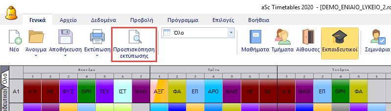 Εάν χρησιμοποιείτε σεμινάριο μπορείτε να εκτυπώσετε ωρολόγιο πρόγραμμα για κάθε μαθητή. Δείτε τις παρακάτω εικόνες.