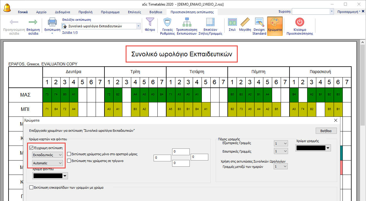 Θέλω να εκτυπώσω το συνολικό ωρολόγιο των εκπαιδευτικών με τα χρώματα των εκπαιδευτικών